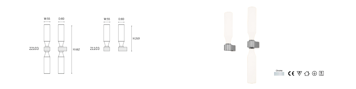 这个一款非常优雅大方的浴灯,时尚的设计结合白玉玻璃、白铬质感的支架带给它一种浑然天成的优雅气质,适合各种浴室环境。白玉玻璃使灯光的漫射效果好,灯光温和不刺眼。这款灯还可以同时使用单灯和双灯,具备耐腐蚀,耐氧化,IP44。