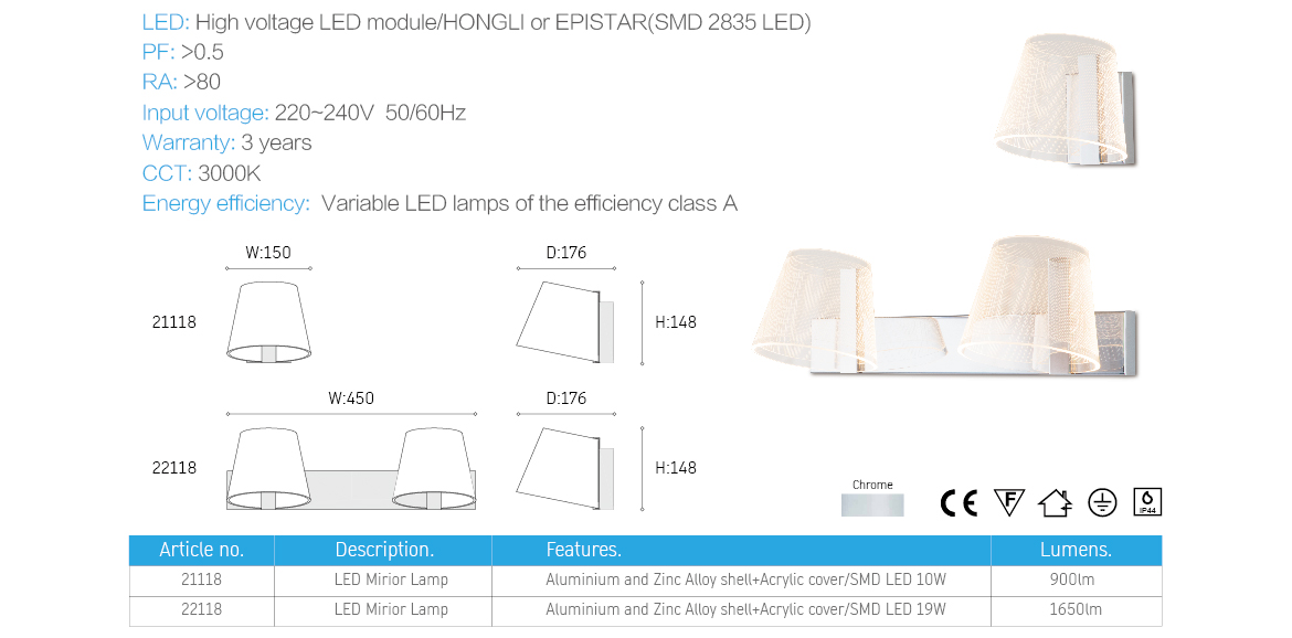A typical trapezoid wall lamp, with photo logy oval acrylic light-guide technology, the collision of modern and traditional, make a difference artistic spark, special spot on the oval surface likes the star light in night. Let you feel in the brilliant start night. This lamp with IP44 water proof and have single or double head to choose.